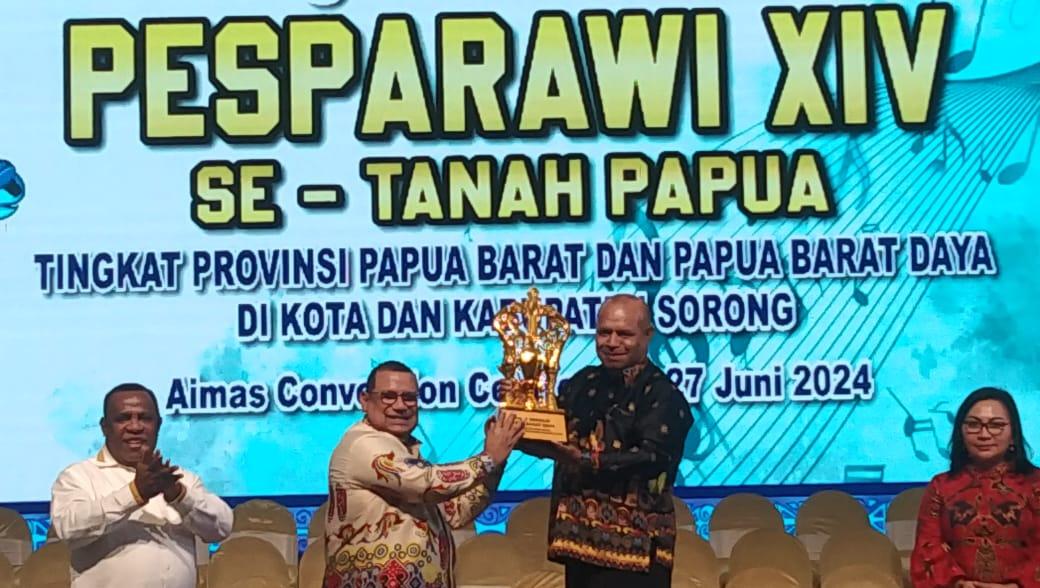 Gemuruh suara sorak sorai kegembiraan kontingen Kota Sorong terdengar menggelegar didalam Gedung Aimas Convention Center, dalam Acara Closing Award Ceremony Pesparawi XIV se-Tanah Papua tingkat Provinsi Papua Barat – Papua Barat Daya, Kamis malam (27/6/2024).