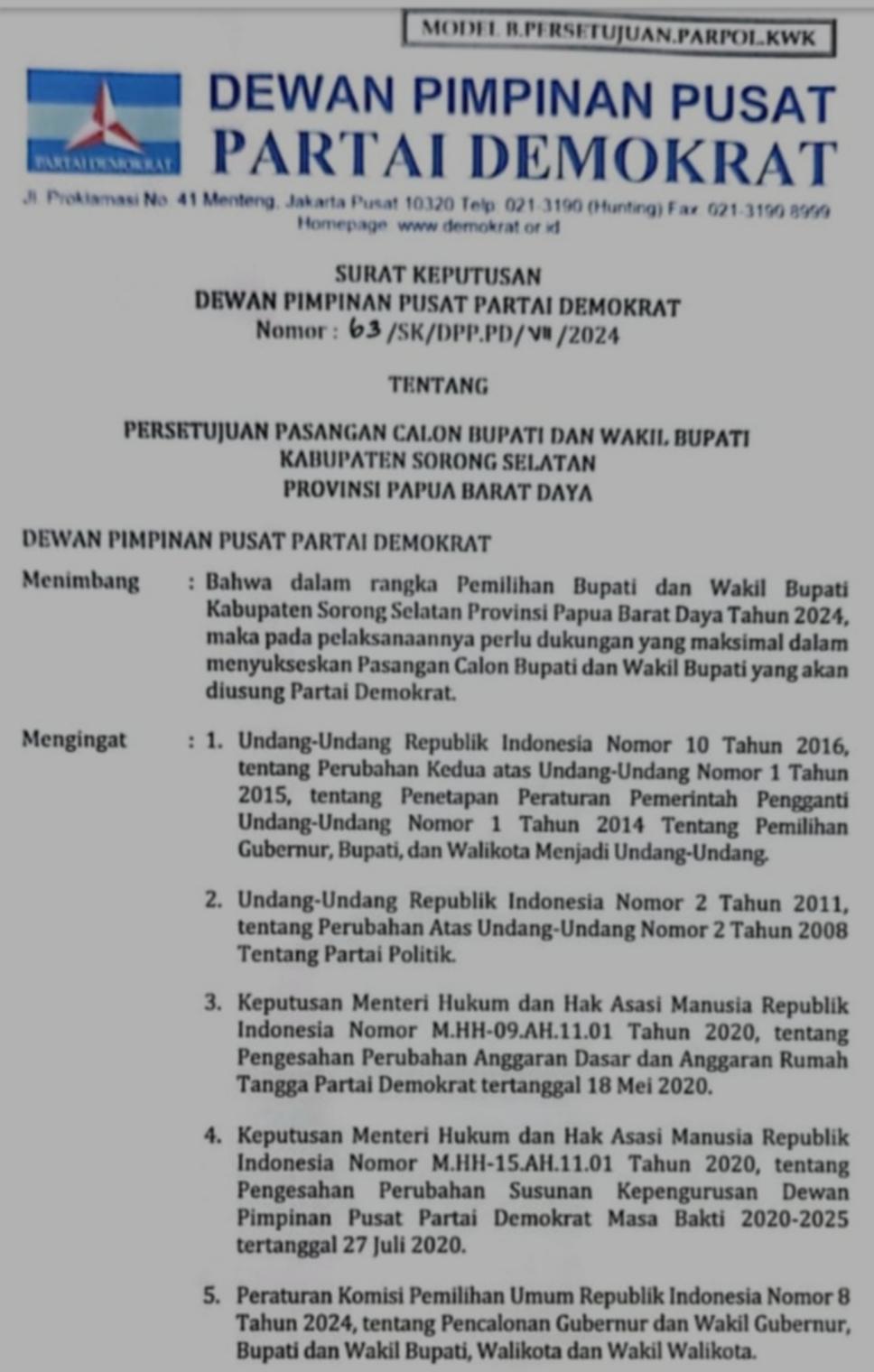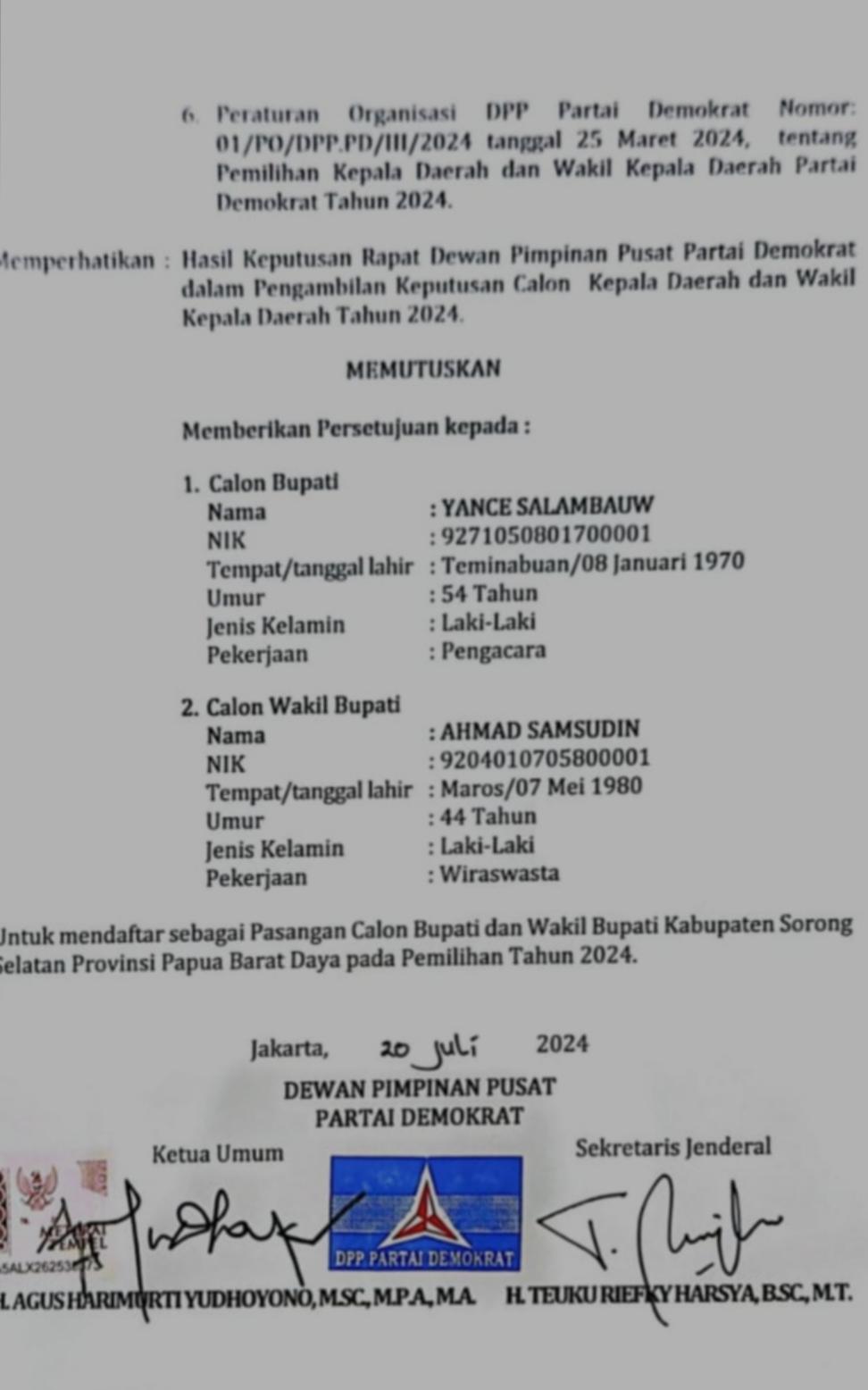 Dimana dalam SK tersebut, DPP Partai Demokrat memutuskan mengusung pasangan Yance Salambauw – Ahmad Samsudin sebagai calon Bupati-Wakil Bupati Sorong Selatan pada Pilkada Kabupaten Sorong Selatan 2024.