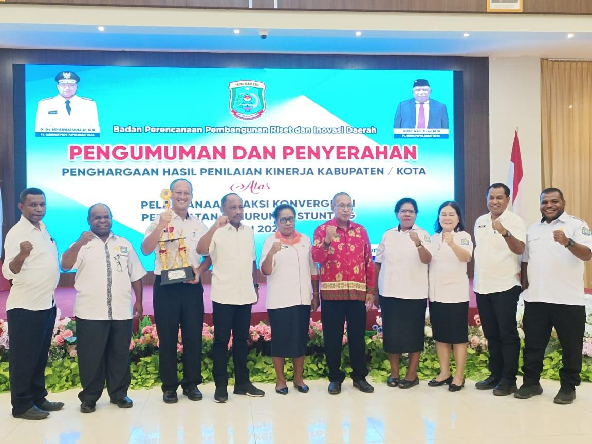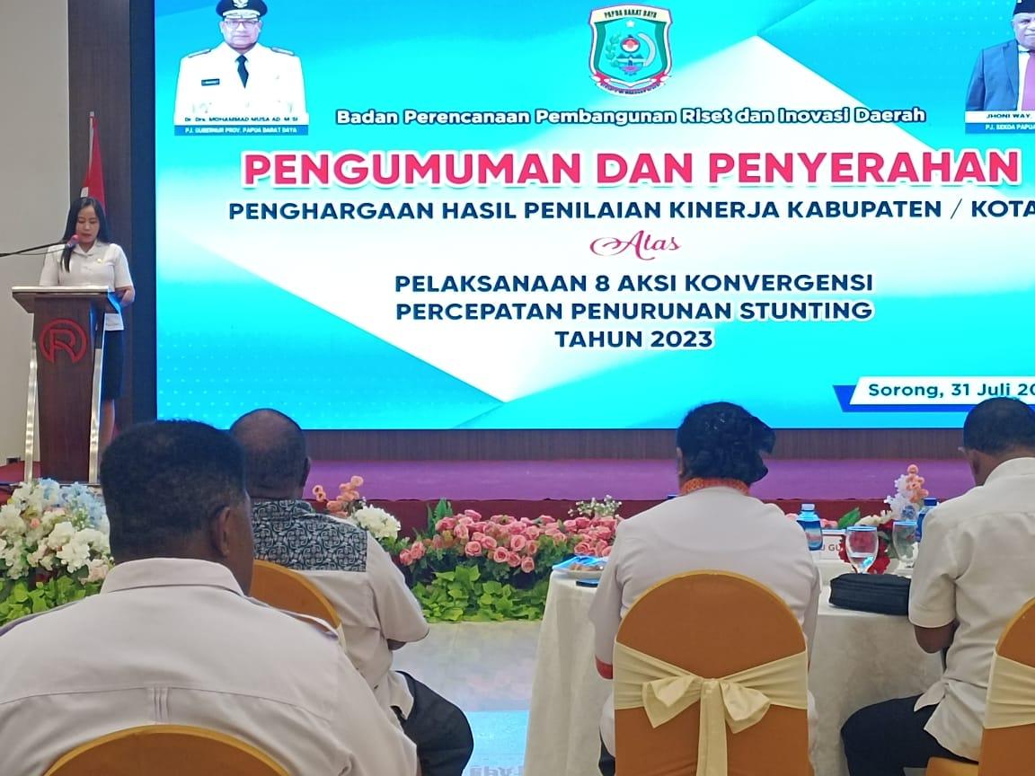 Badan Perencanaan Pembangunan Riset dan Inovasi Daerah (Bapperida) Provinsi Papua Barat Daya mengumumkan dan menyerahkan penghargaan hasil penilaian kinerja Kabupaten/Kota atas pelaksanaan 8 aksi konvergensi percepatan penurunan stunting tahun 2023, yang berlangsung di Hotel Rylich Panorama Sorong, Rabu (31/7/2024).