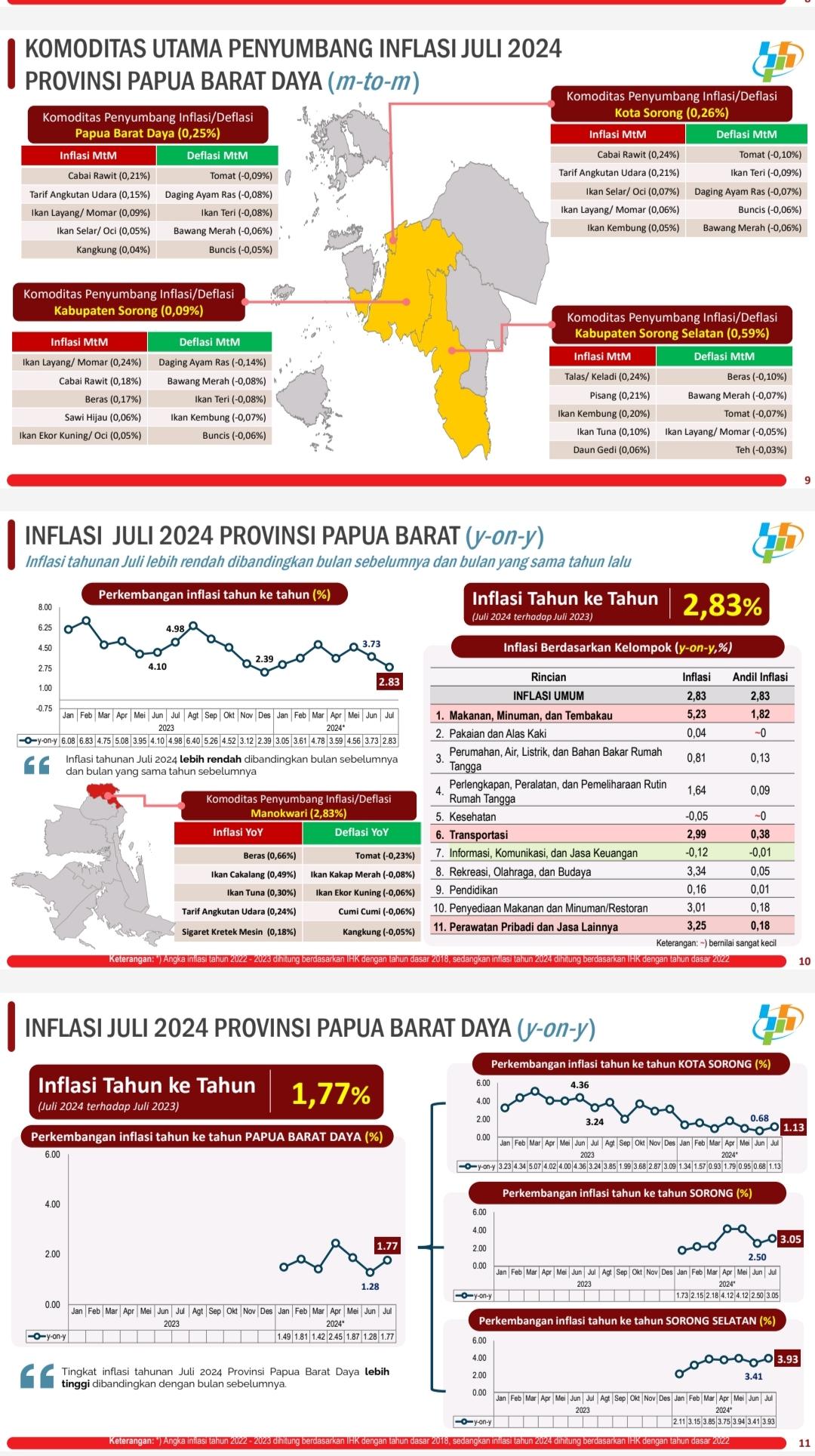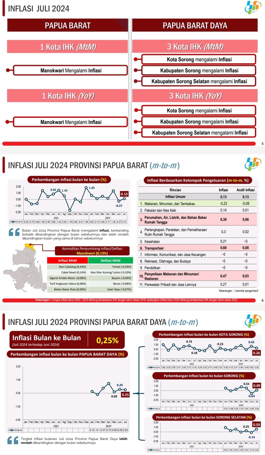 Bulan Juli 2024, Provinsi Papua Barat mengalami inflasi m-to-m sebesar 0,13 persen dan inflasi y-on-y sebesar 2,83 persen. Sementara Provinsi Papua Barat Daya mengalami inflasi m-to-m sebesar 0,25 persen dan inflasi y-on-y sebesar 1,77 persen.