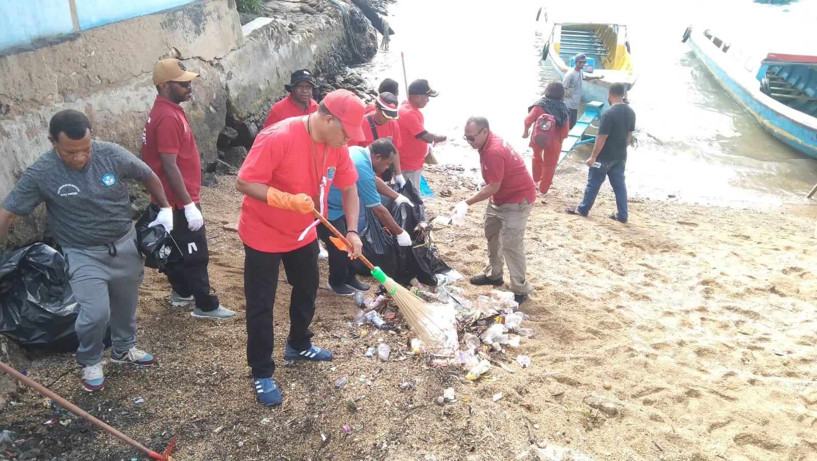 Aksi bersih pantai dan laut yang dilakukan di Pulau Doom, Distrik Sorong Kepulauan, Kota Sorong, Papua Barat Daya, tampak melibatkan seluruh Aparatur Sipil Negara (ASN) yang ada di lingkup Pemprov Papua Barat Daya dan juga TNI Angkatan Laut.
