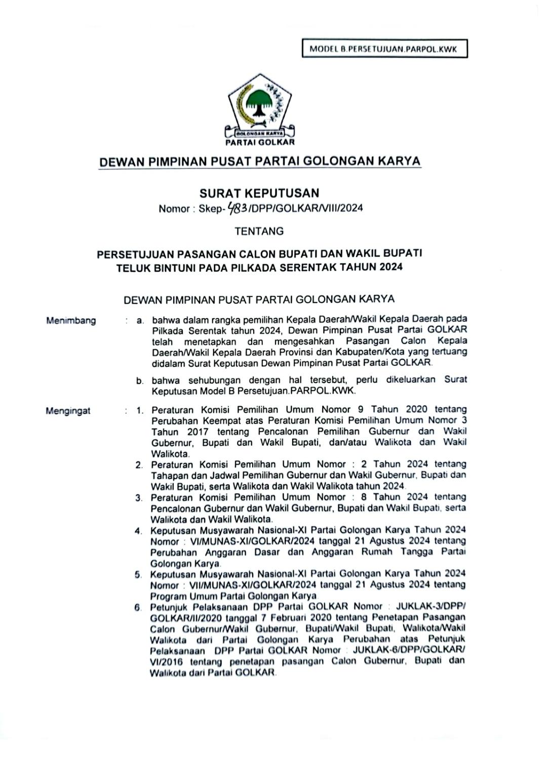 Hal ini dibuktikan dengan dikeluarkannya Surat Keputusan Model B Persetujuan.PARPOL.KWK yang ditanda tangani langsung Ketua Umum Partai Golkar Bahlil Lahadalia dan Sekretaris Jenderal Partai Golkar M Sarmuji tertanggal 24 Agustus 2024.