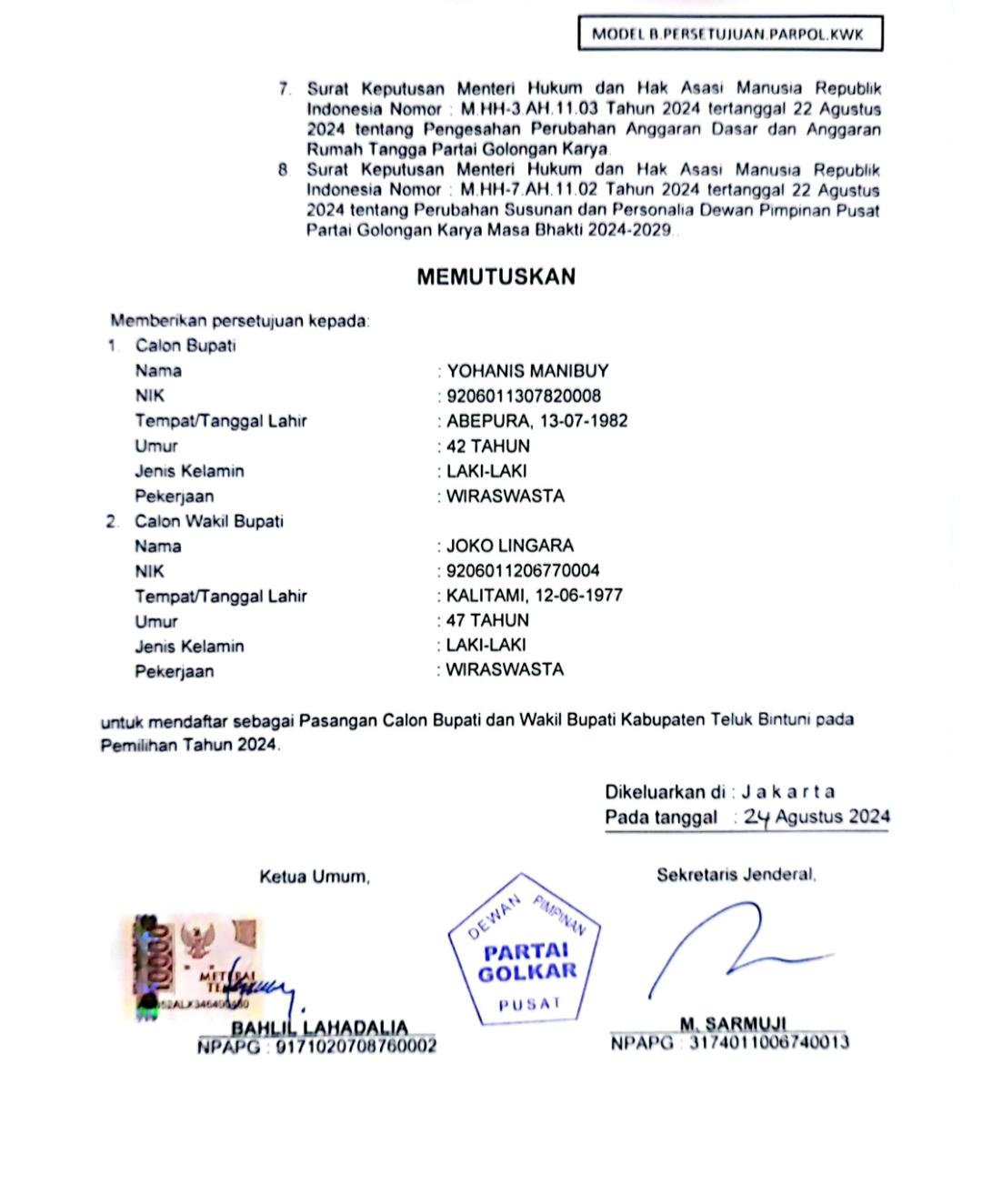 Dimana Surat Keputusan Model B Persetujuan.PARPOL.KWK tersebut digunakan Yohanis Manibuy – Joko Lingara, untuk mendaftar sebagai pasangan calon Bupati-Wakil Bupati Kabupaten Teluk Bintuni ke Komisi Pemilihan Umum (KPU).