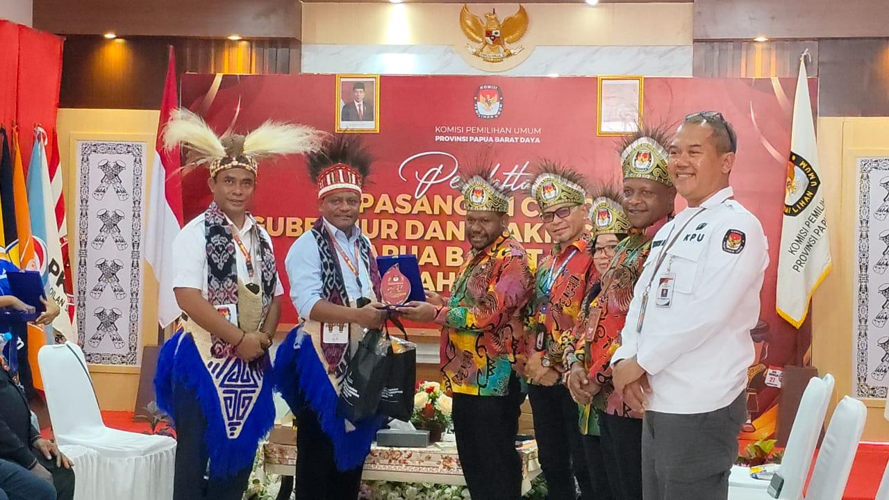 Pasangan Abdul Faris Umlati dan Petrus Kasihiew mendaftar ke Komisi Pemilihan Umum Papua Barat Daya, sebagai pasangan calon Gubernur-Wakil Gubernur Papua Barat Daya periode 2024-2029, Kamis (29/8/2024).