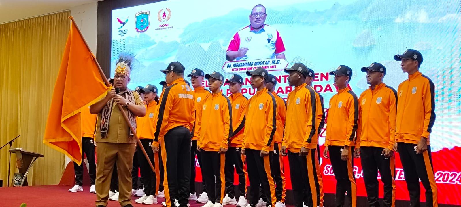 Pelepasan kontingen ditandai dengan penyerahan bendera pataka KONI Papua Barat Daya oleh Pj Gubernur Mohammad Musa’ad kepada Ketua Harian KONI Papua Barat Daya Abubakar Gusti.