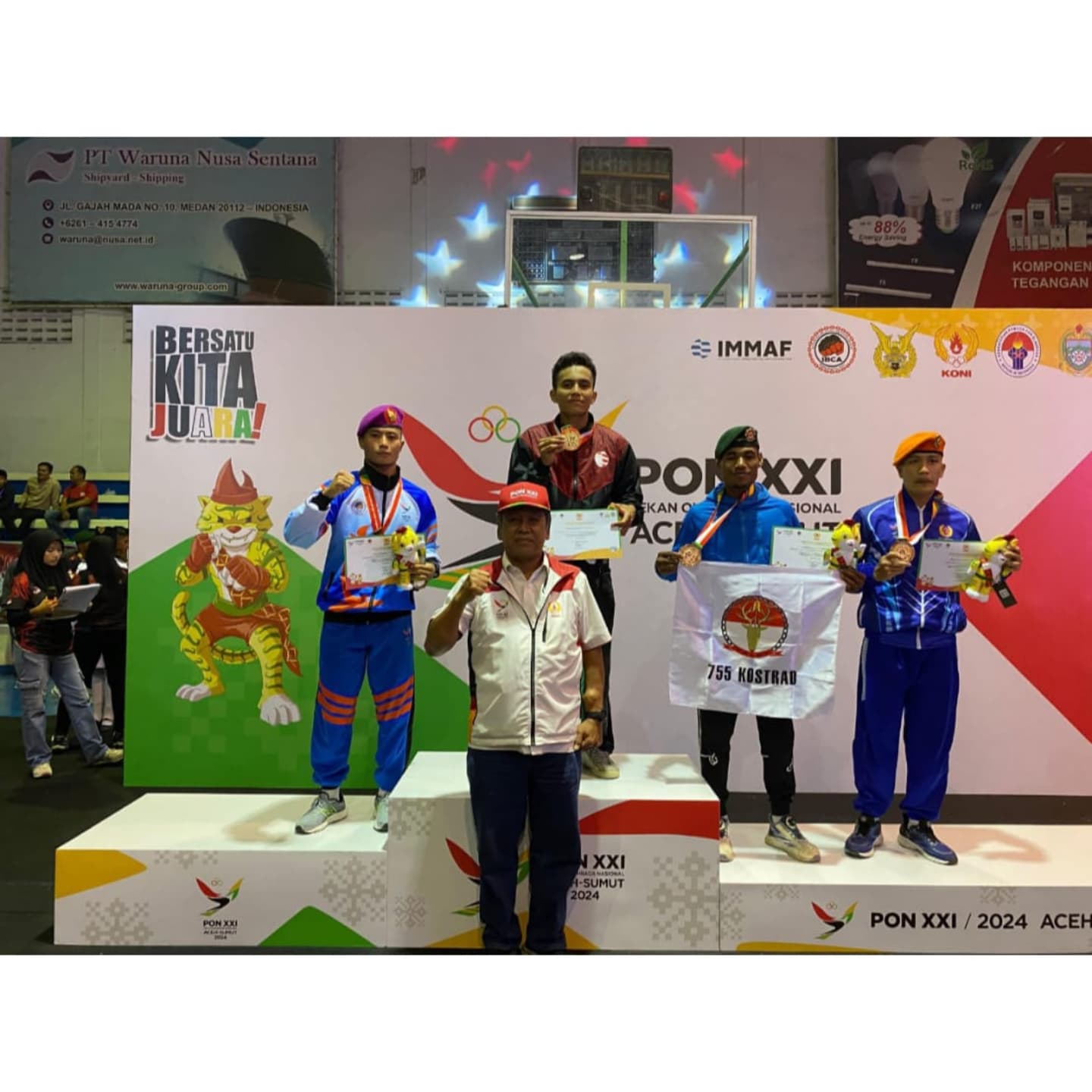Prajurit Pasmar 3 kembali menorehkan prestasi gemilang dengan berhasil meraih medali perak pada Pekan Olahraga Nasional (PON) XXI Aceh-Sumut pada cabang MMA stand up putra, yang berlangsung di Gor Basket Sioux Lanud Soewondo, Medan, Sumatra Utara, Kamis (19/9/2024).