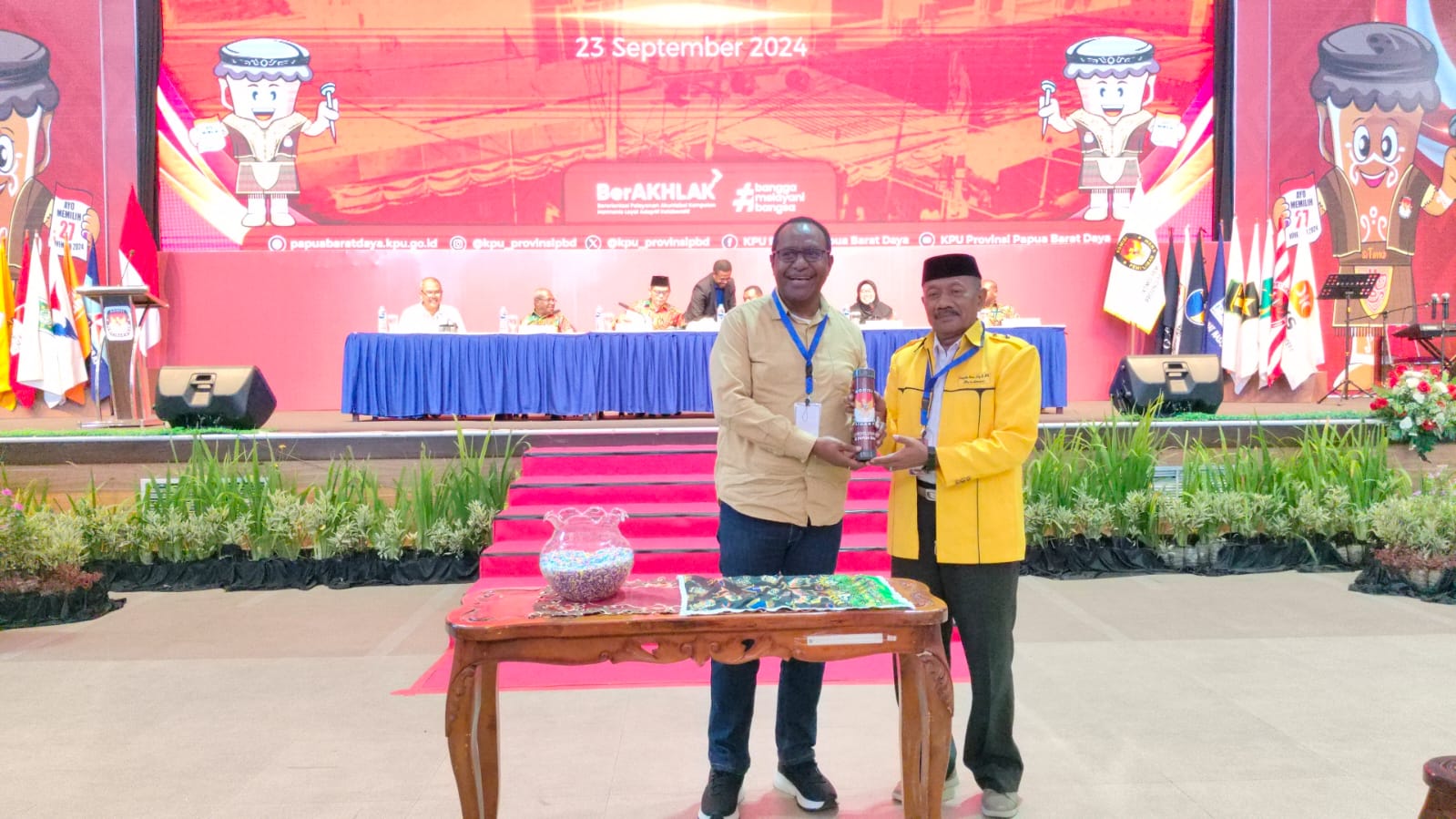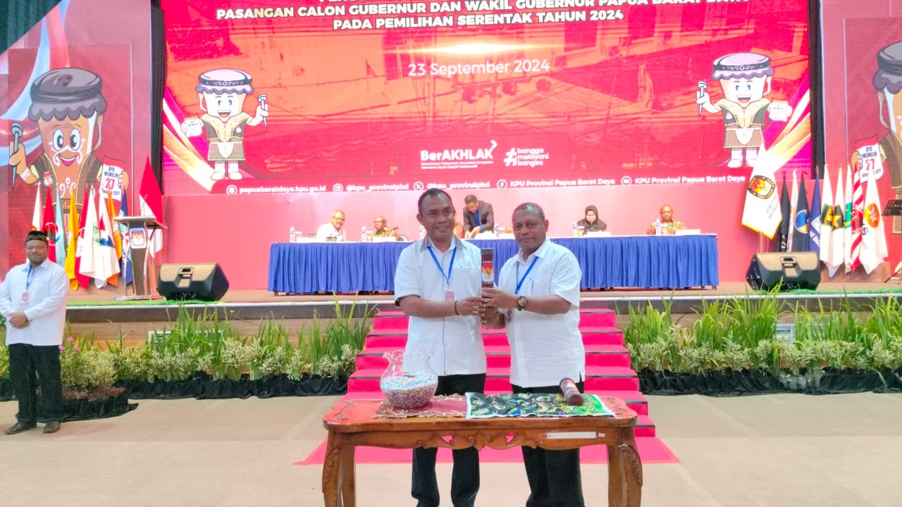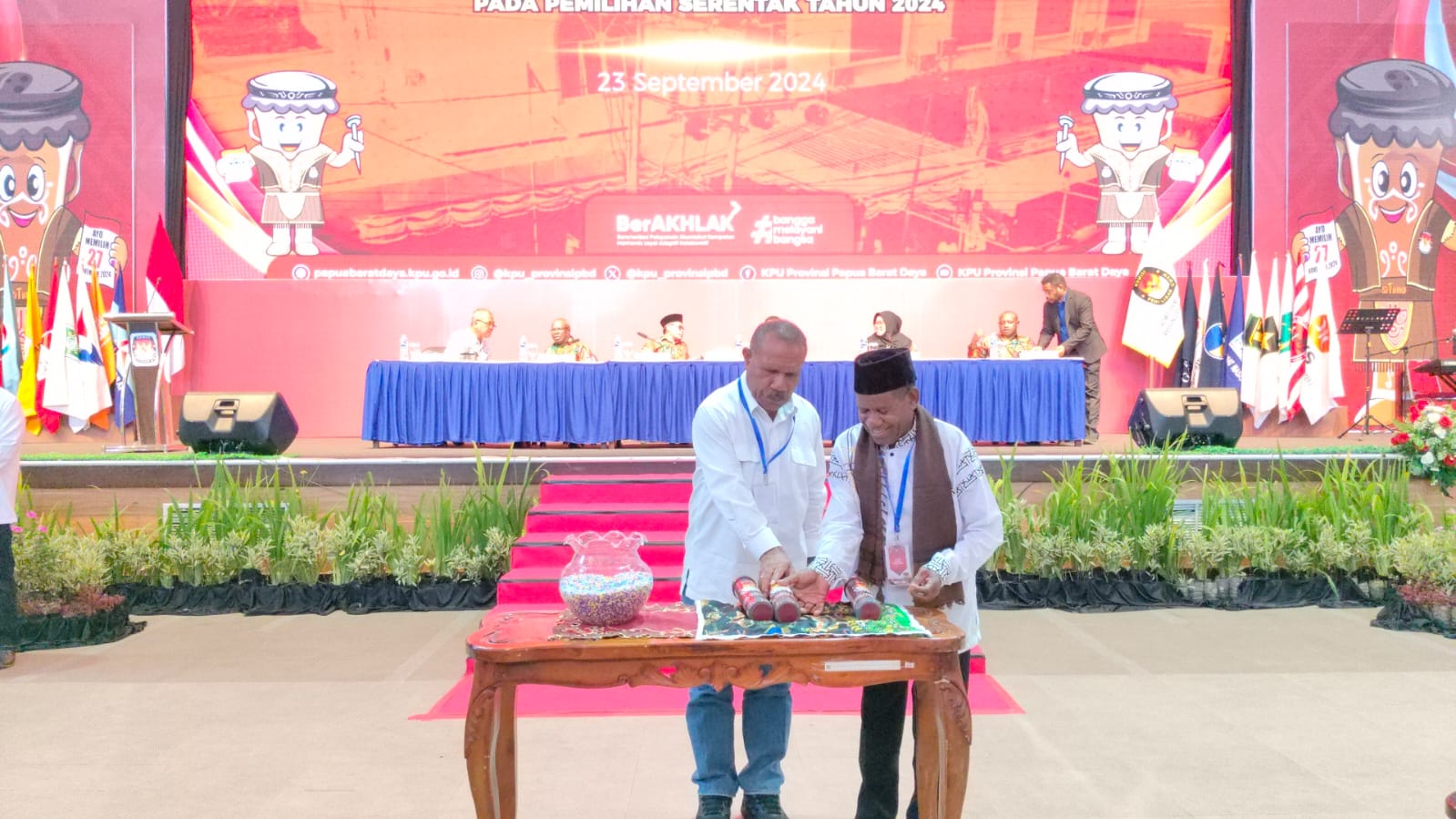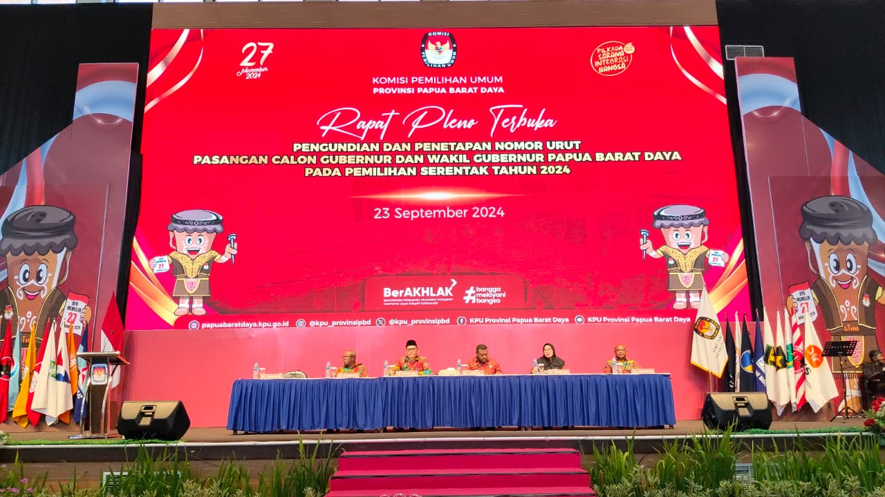 Komisi Pemilihan Umum Provinsi Papua Barat Daya (KPU PBD) menggelar Rapat Pleno Terbuka Pengundian dan Penetapan Nomor Urut Pasangan Calon Gubernur-Wakil Gubernur Provinsi Papua Barat Daya, yang berlangsung di Gedung LJ Kompleks Kantor Walikota Sorong, Senin (23/9/2024).
