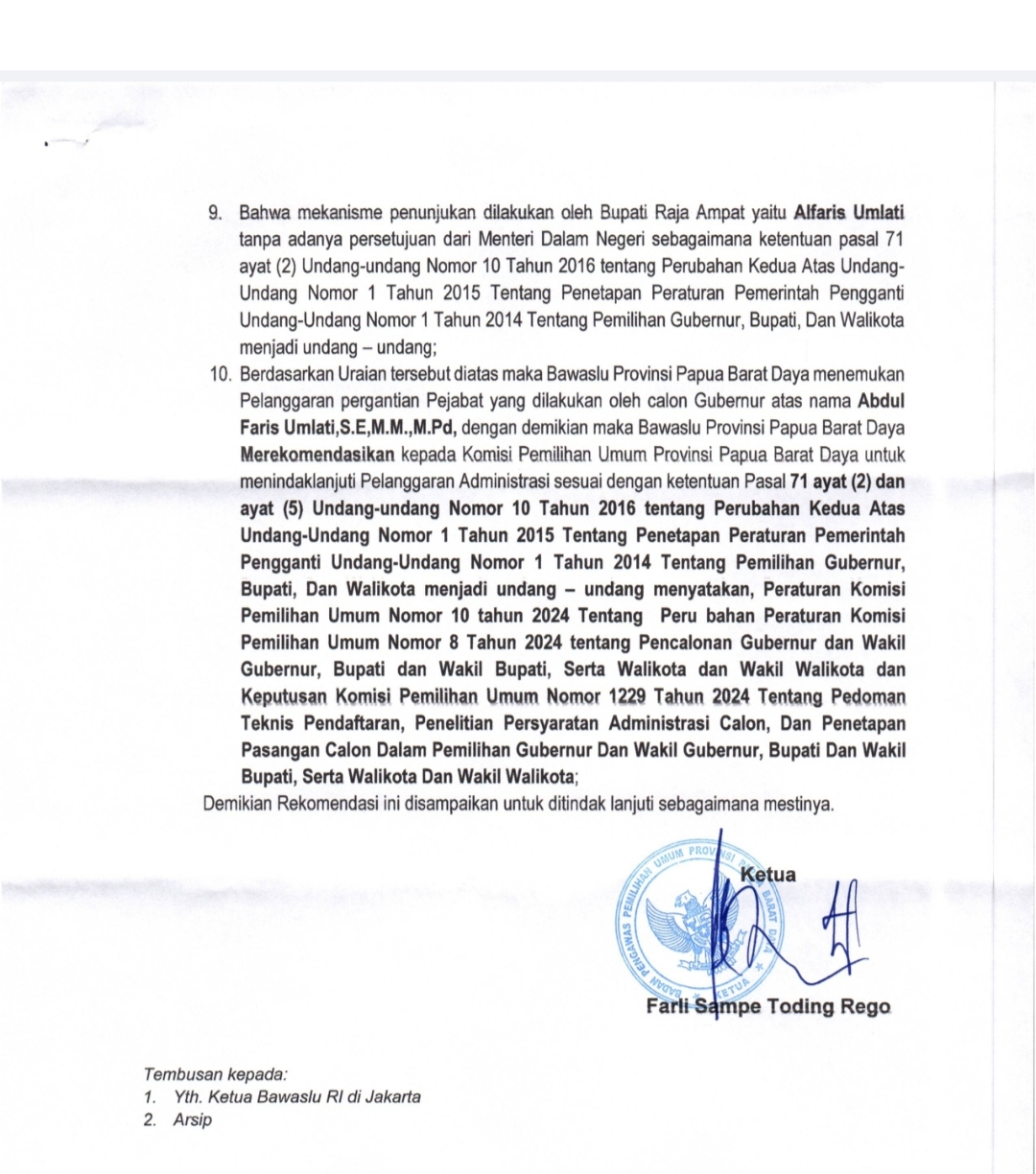 Komisioner Bawaslu Papua Barat Daya Zatriawati mengatakan, Surat Rekomendasi Nomor 554/PM.01.01/K.PBD/10/2024 tertanggal 28 Oktober 2024 dikeluarkan Bawaslu Provinsi Papua Barat Daya terkait pelanggaran administrasi penggantian pejabat yang dilakukan calon Gubernur Papua Barat Daya nomor urut 1 Abdul Faris Umlati.