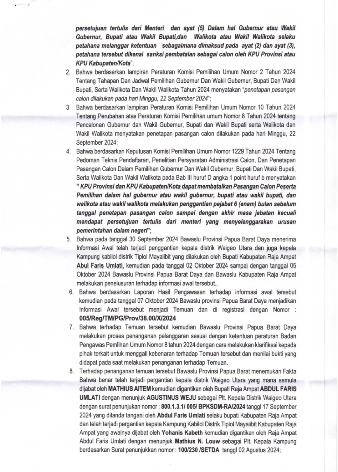 Calon Gubernur Papua Barat Daya nomor urut 1 Abdul Faris Umlati dinyatakan terbukti melakukan pelanggaran administrasi. Dimana Bupati Raja Ampat dua periode ini melakukan penggantian Kepala Distrik Waigeo Utara yang semula dijabat oleh Mathius Aitem dan menunjuk Agustinus Weju sebagai Plt Kepala Distrik Waigeo Utara pada tanggal 17 September 2024.