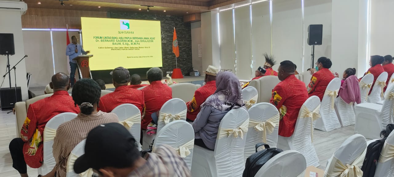 “Lembaga ini sudah dikukuhkan oleh Pemerintah Provinsi Papua Barat Daya. Oleh karena itu, bapak dan ibu yang ada di forum lintas suku asli papua merasa punya beban moril untuk harus berkomunikasi dengan lima kandidat calon Gubernur Papua Barat Daya,” ungkapnya dalam acara Silaturahmi Forum Lintas Suku Asli Papua Bersama Anak Adat Bernard Sagrim dan Sirajuddin Bauw calon Gubernur dan calon Wakil Gubernur Papua Barat Daya nomor urut 5, yang berlangsung di Rylich Panorama Hotel Sorong, Rabu (6/11/2024).