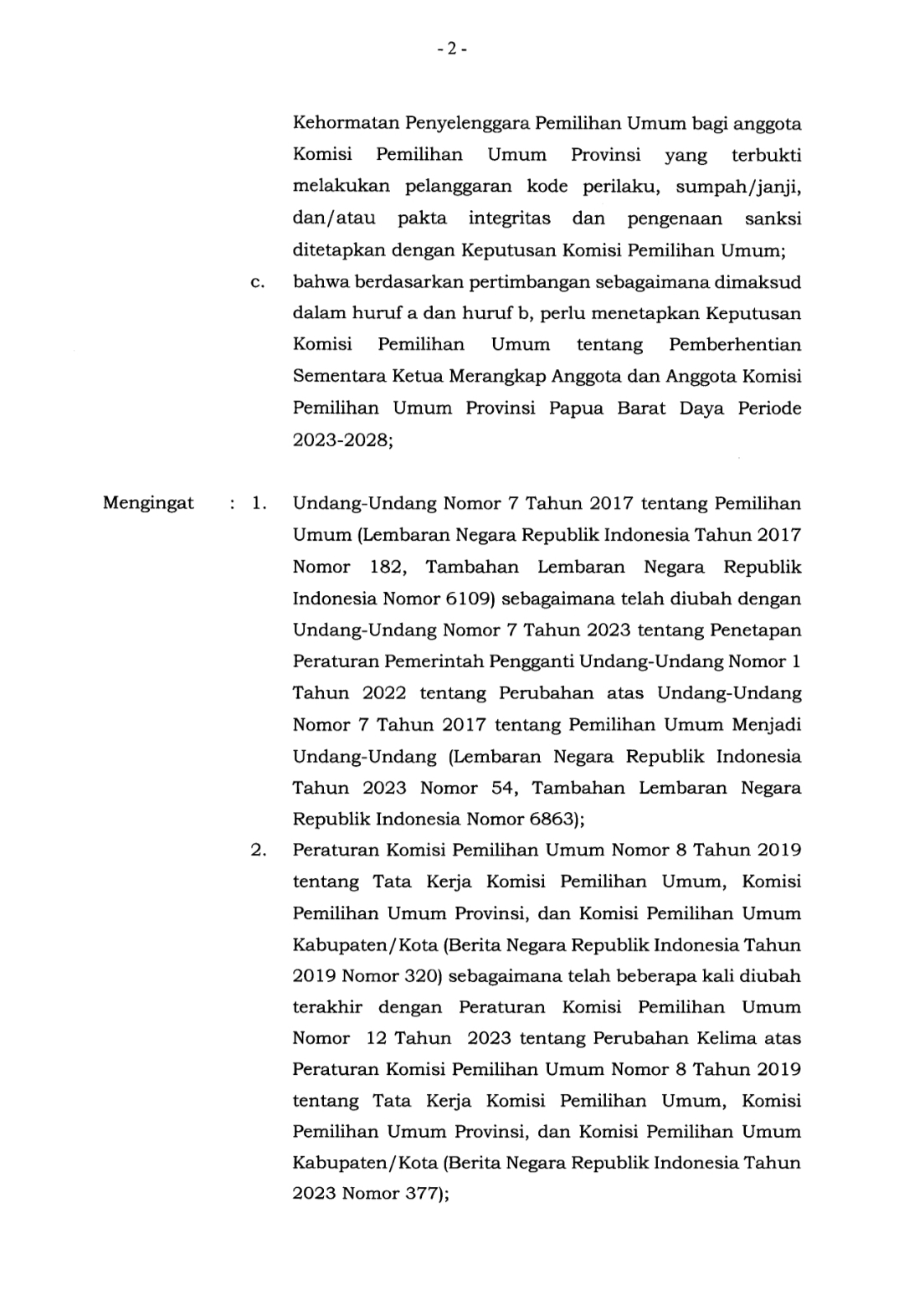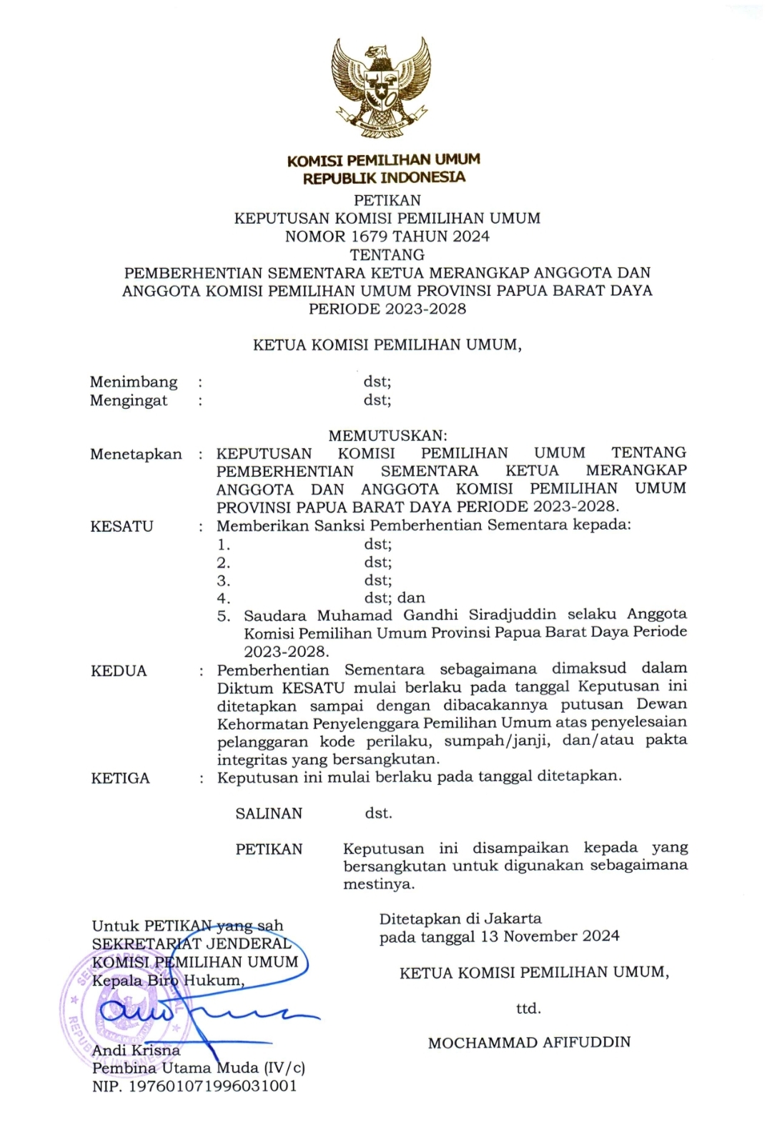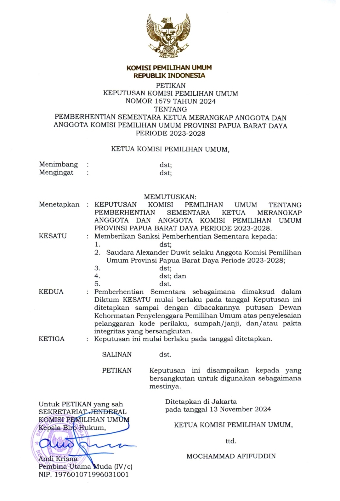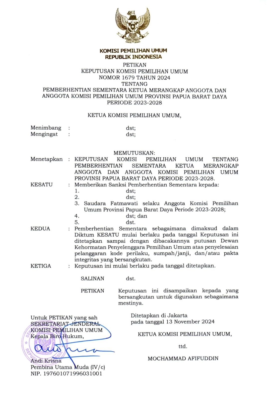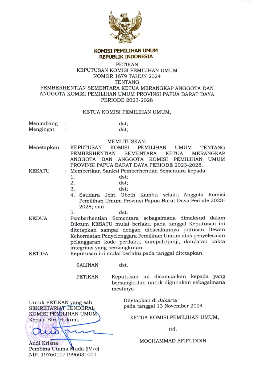 KPU Republik Indonesia mengeluarkan Keputusan Komisi Pemilihan Umum Nomor 1679 Tahun 2024 tentang Pemberhentian Sementara Ketua Merangkap Anggota dan Anggota Komisi Pemilihan Umum Provinsi Papua Barat Daya periode 2023-2028, Rabu (13/11/2024).