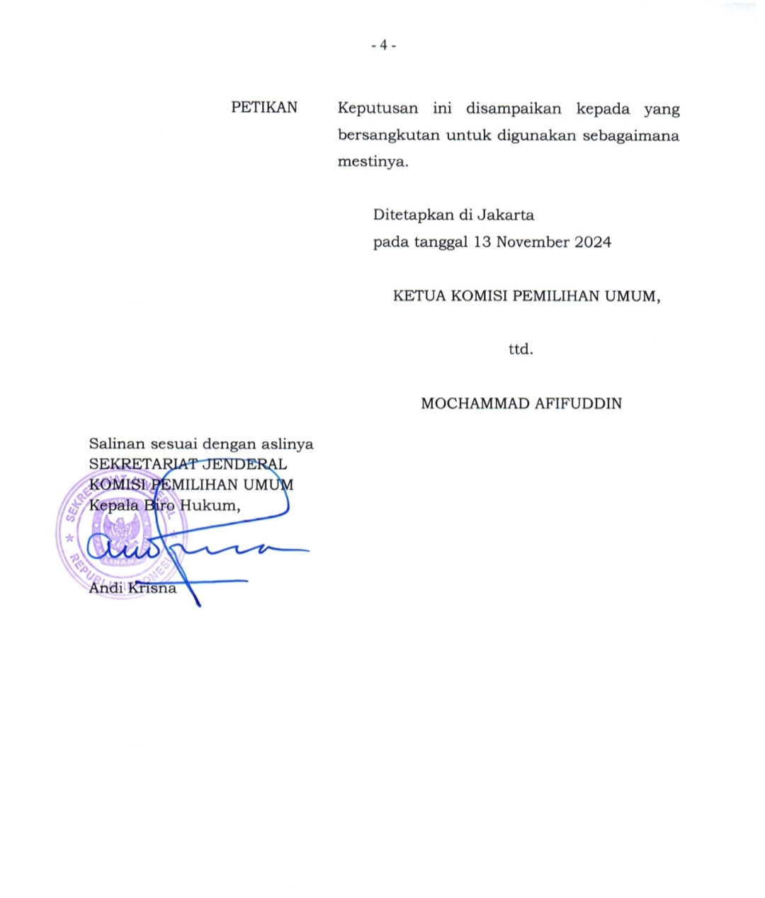 Berdasarkan salinan petikan keputusan yang ditetapkan di Jakarta dan ditandatangani langsung Sekretariat Jenderal Komisi Pemilihan Umum Kepala Biro Hukum Andi Krisna tanggal 13 November 2024, memberikan sanksi pemberhentian sementara kepada :
