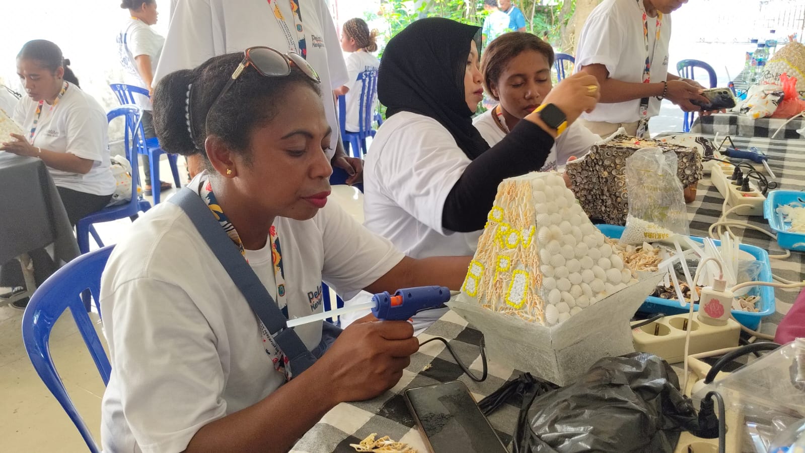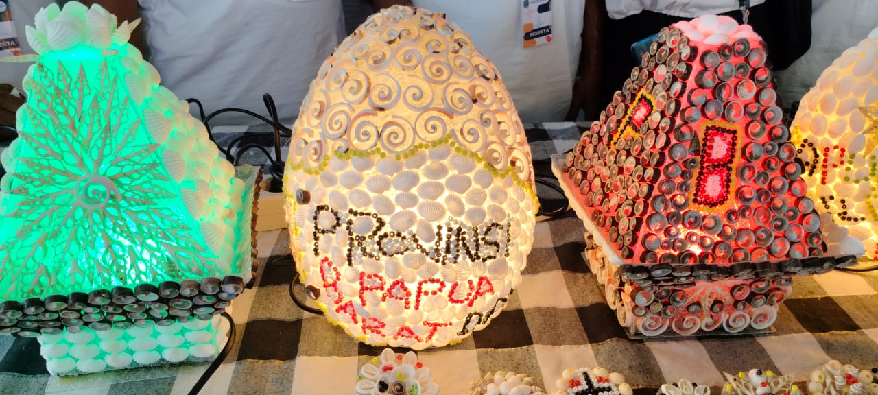 “Kulit kerang ini kalau di tempat kami di Raja Ampat banyak sekali di buang begitu saja di pantai. Padahal kalau kita bikin hiasan begini ternyata bagus sekali dan pasti laku kalau dijual,” ungkap beberapa mama Papua sambil membuat kerajinan.