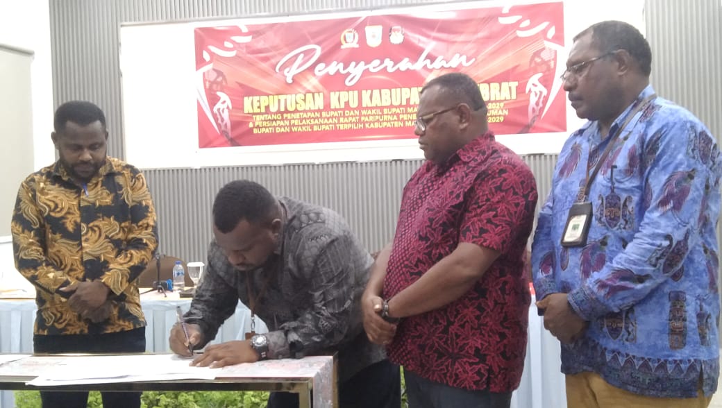 Ketua KPU Maybrat Dominggus Isir mengatakan, dirinya telah secara resmi menyerahkan Keputusan Komisi Pemilihan Umum Kabupaten Maybrat Nomor 2 tahun 2025 tentang penetapan pasangan calon bupati dan wakil bupati terpilih pasca adanya putusan Mahkamah Konstitusi Republik Indonesia.