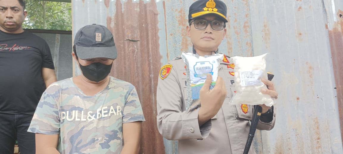 “Kami juga mengamankan barang bukti berupa bahan baku, yang berdasarkan keterangan dari pelaku bahwa bahan baku tersebut didatangkan langsung dari China,” beber Happy.