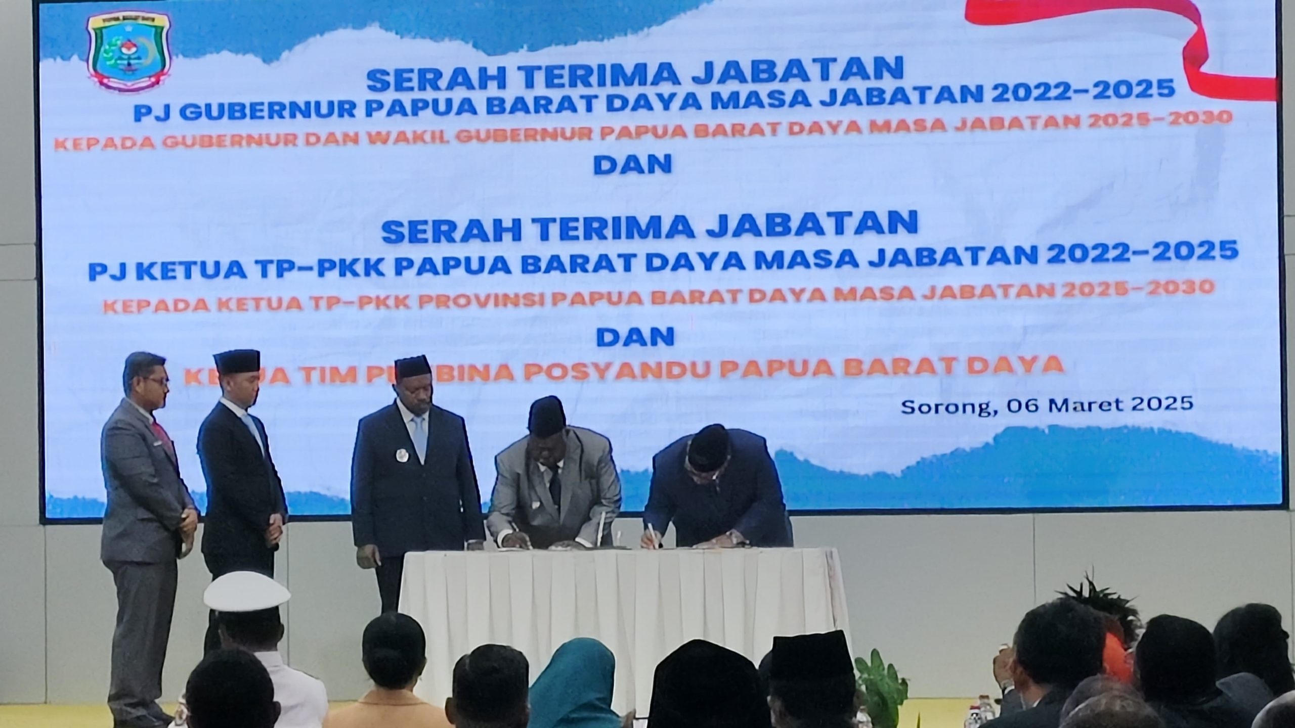 Penjabat Gubernur Papua Barat Daya masa jabatan 2022-2025 Mohammad Musa’ad secara resmi menyerahkan jabatan, tugas, wewenang serta tanggung jawab kepada Gubernur dan Wakil Gubernur Papua Barat Daya masa jabatan 2025-2030 Elisa Kambu dan Ahmad Nausrau, bertempat di Hotel Vega, Kota Sorong, Kamis (6/3/2025).