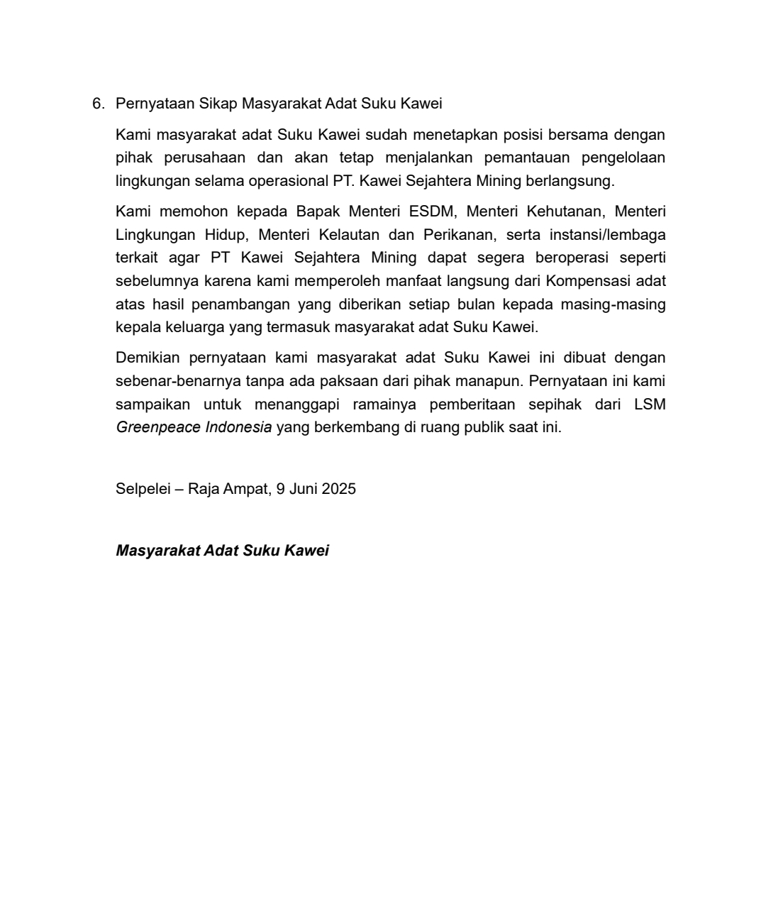 “Kami masyarakat adat Suku Kawei telah menetapkan posisi bersama dengan pihak perusahaan dan akan tetap menjalankan pemantauan pengelolaan lingkungan selama operasional PT Kawei Sejahtera Mining berlangsung,” tegas Ketua Adat Suku Kawei Korinus Ayelo, Selasa (10/6/2025).