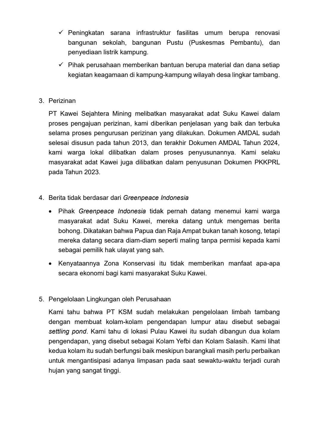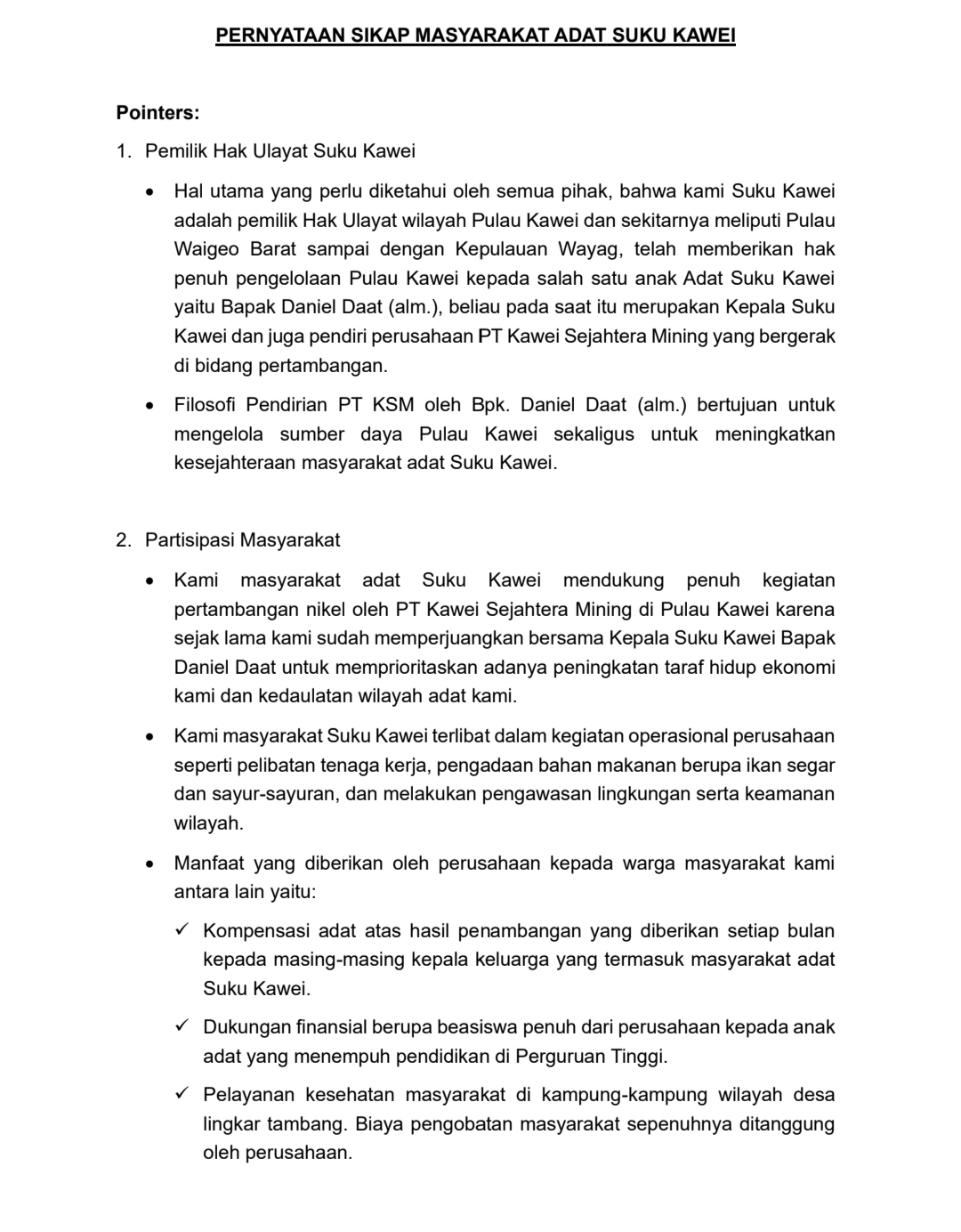 PT Kawei Sejahtera Mining, disebut telah melibatkan masyarakat adat dalam penyusunan seluruh dokumen perizinan, termasuk AMDAL tahun 2013 dan revisinya pada 2024, serta PKKPRL tahun 2023. Proses ini berjalan dengan penjelasan terbuka dan partisipatif, menurut warga.