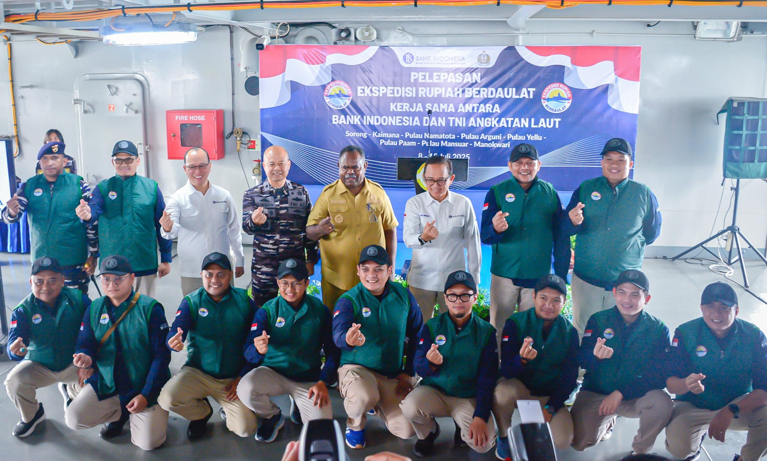 Bank Indonesia bersama TNI Angkatan Laut secara resmi melepas Tim Ekspedisi Rupiah Berdaulat (ERB) 2025 dari Kota Sorong, untuk melaksanakan layanan kas keliling dan edukasi di wilayah Terdepan, Terluar dan Terpencil (3T) di Provinsi Papua Barat dan Papua Barat Daya, Selasa (8/5/2025).