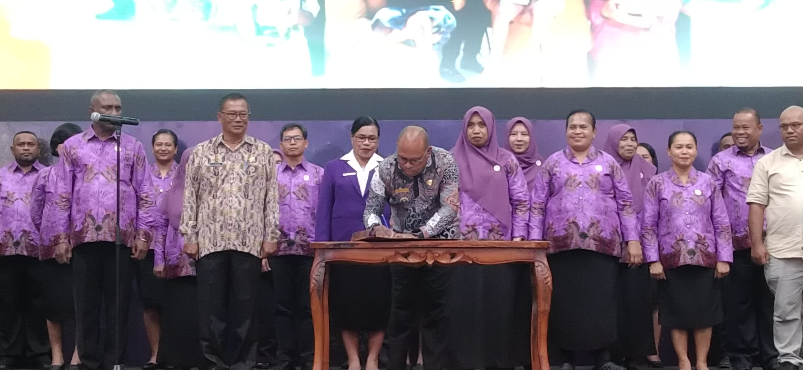 Wali Kota Sorong Septinus Lobat melantik dan mengukuhkan Tim Pembina Posyandu Kota Sorong Masa Bakti Tahun 2025-2030, yang berlangsung di Gedung Lambert Jitmau, Jumat (3/10/2025).