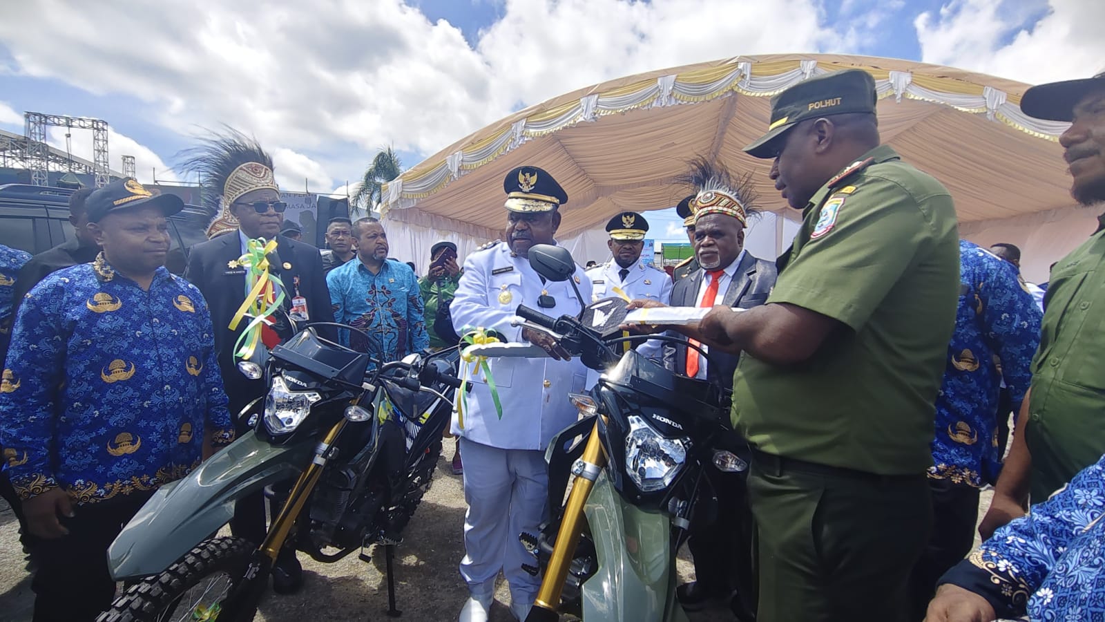 Sorong — Pemerintah Provinsi Papua Barat Daya melalui Dinas Lingkungan Hidup, Kehutanan dan Pertanahan Provinsi Papua Barat Daya menyerahkan bantuan 7 unit motor dinas kepada para petugas Polisi Kehutanan (Polhut), yang bertugas di 5 kabupaten dan 1 kota di wilayah Papua Barat Daya.