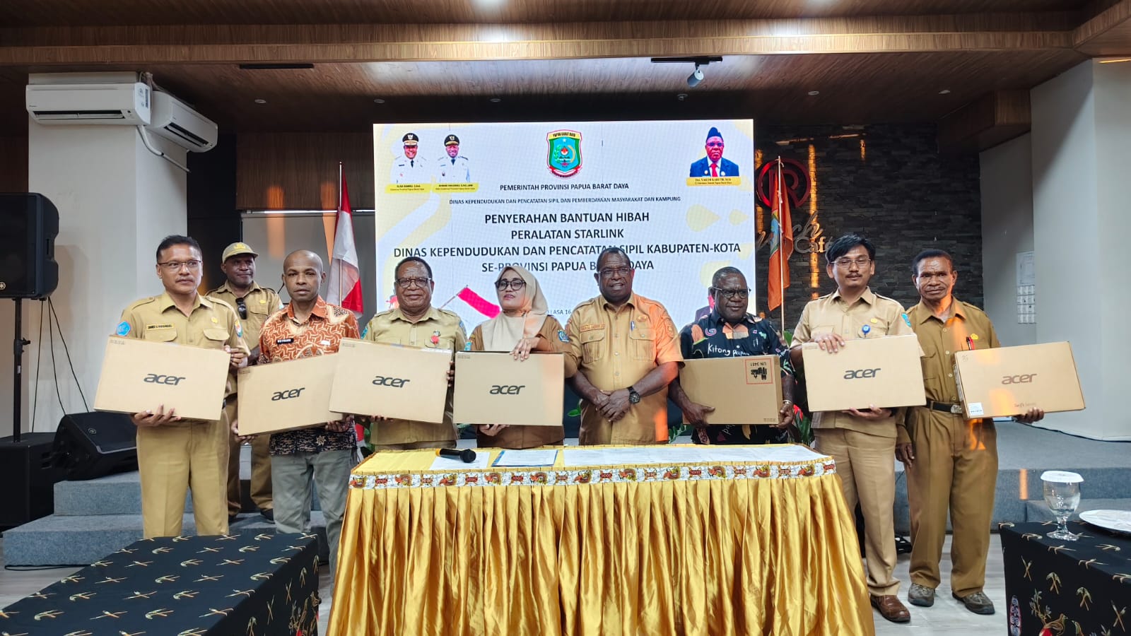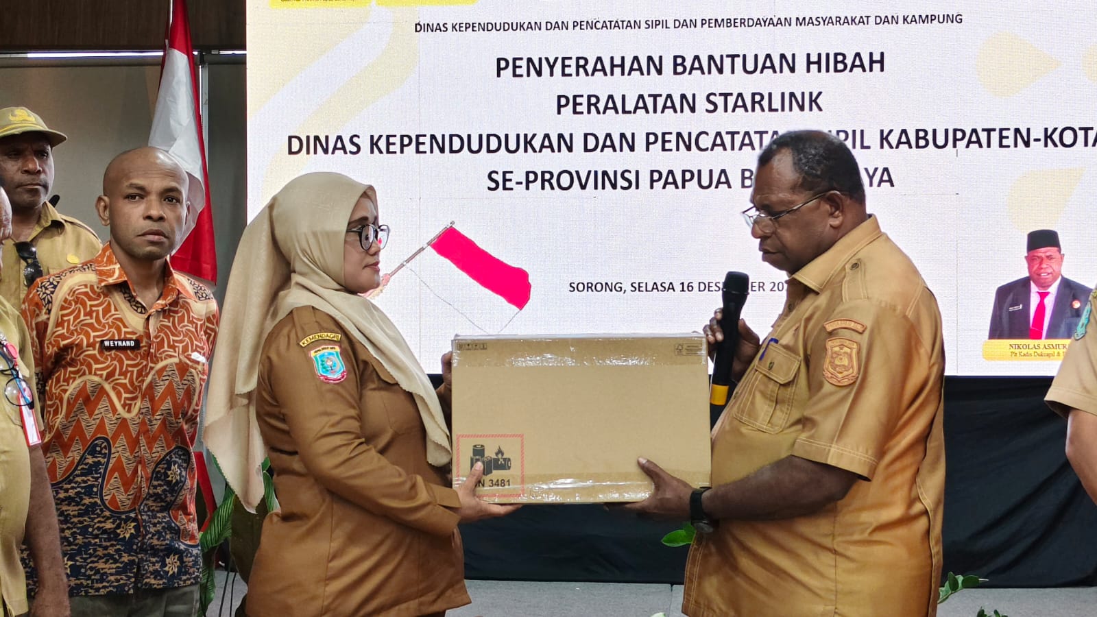Bantuan yang bersumber dari dana hibah tersebut meliputi satu unit perangkat Starlink, satu unit laptop, dan satu unit printer, yang diserahkan langsung oleh Kepala Disdukcapil-PMK Papua Barat Daya, Nicolas Asmuruf, di Panorama Hotel, Sorong, Selasa (16/12/2025).