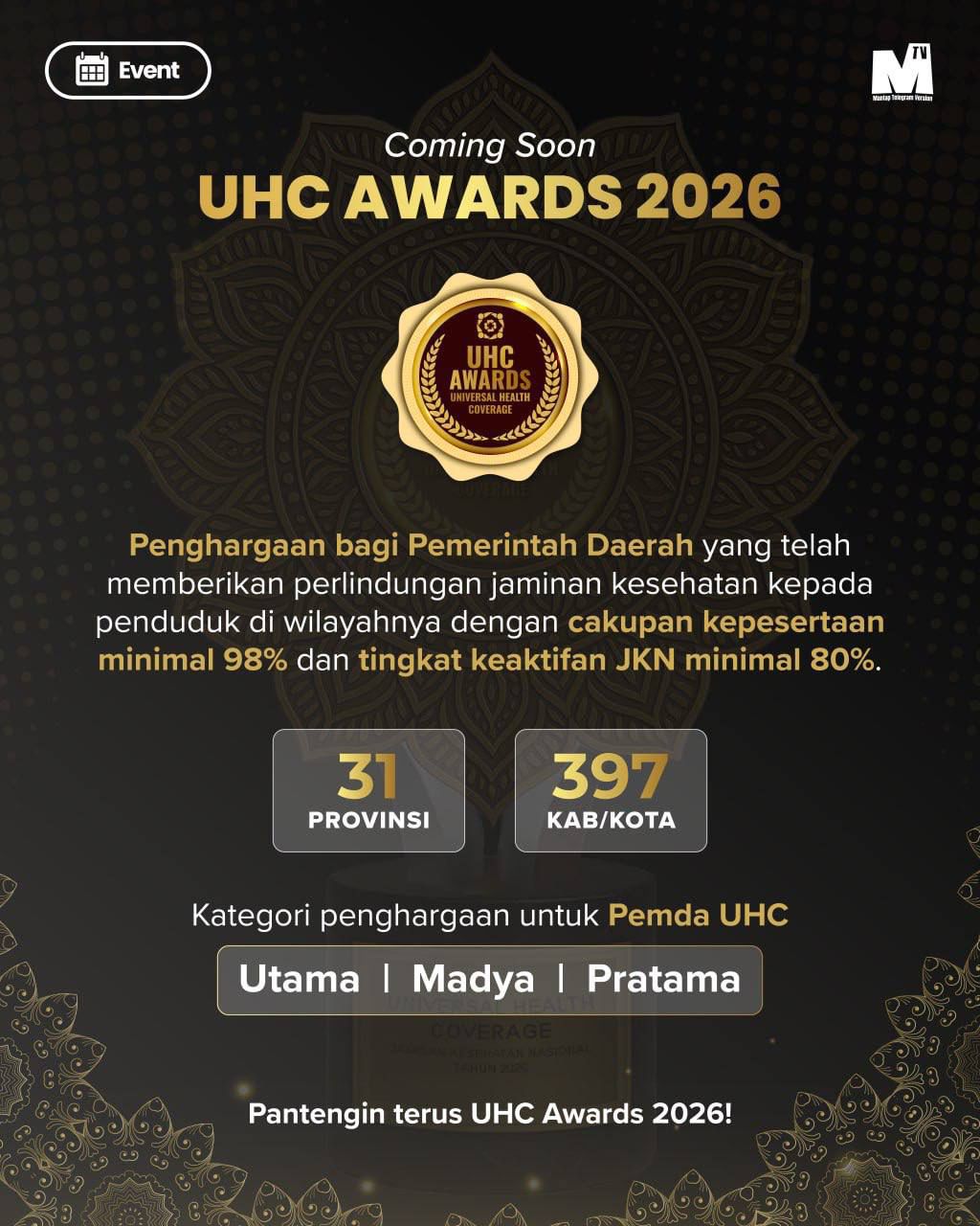 UHC Awards merupakan bentuk apresiasi kepada Pemda yang memiliki komitmen tinggi dalam mencapai Universal Health Coverage (UHC). UHC adalah kondisi ketika seluruh penduduk telah terdaftar sebagai peserta JKN dan memiliki tingkat keaktifan yang baik, sehingga dapat mengakses layanan kesehatan tanpa hambatan biaya.