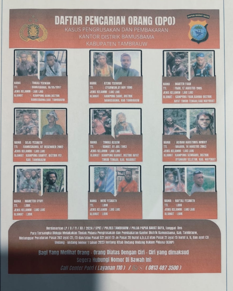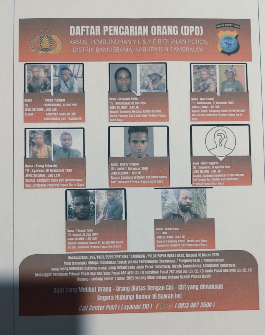 Dalam press release kelima yang digelar pada Kamis (09/04/2026), aparat kepolisian resmi merilis Daftar Pencarian Orang (DPO) yang berkaitan dengan sejumlah kasus kriminal berat di Kabupaten Tambrauw.
