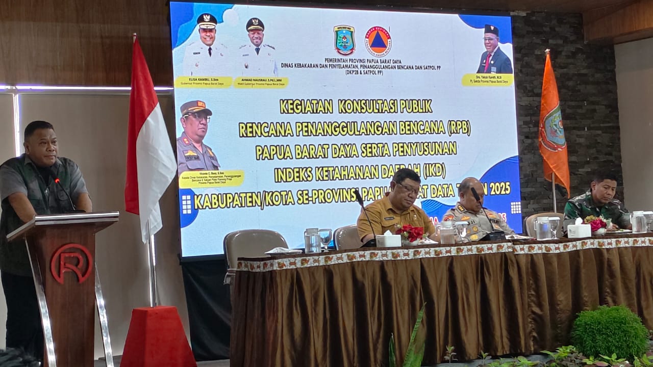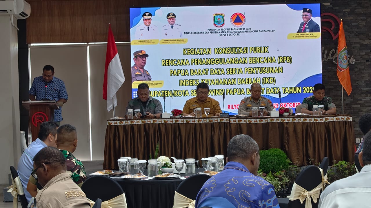 Dalam rangka mensosialisasikan final draft Rencana Penanggulangan Bencana (RPB) Provinsi Papua Barat Daya tahun 2025 kepada para pemangku kepentingan, Dinas Kebakaran dan Penyelamatan, Penanggulangan Bencana dan Satpol PP menggelar kegiatan Konsultasi Publik Rencana Penanggulangan Bencana (RPB) Papua Barat Daya Serta Penyusunan Indeks Ketahanan Daerah (IKD) Kabupaten/Kota Provinsi Papua Barat Daya Tahun 2025, yang berlangsung di Rylich Panorama Hotel Sorong, Kamis (23/10/2025).